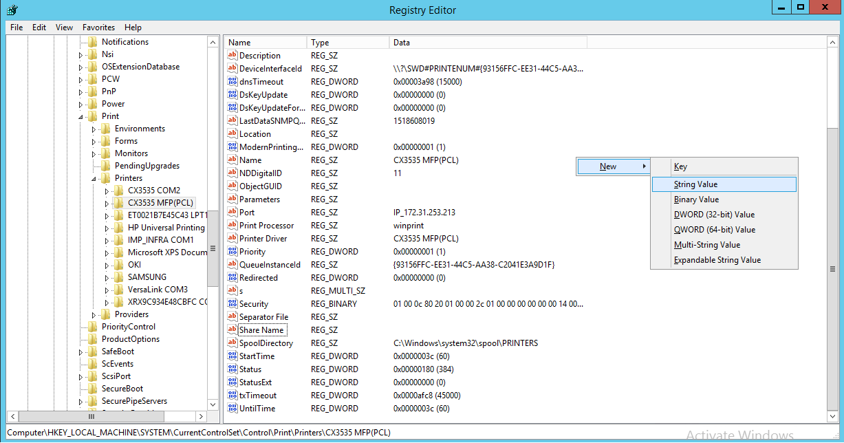 To add a rule access the Registry Editor (regedit - Run) > Access the tabs HKEY_LOCAL_MACHINE\SYSTEM\CurrentControlSet\Control\Print\Printers\ > select the desired printer > with the right click select new "String value"