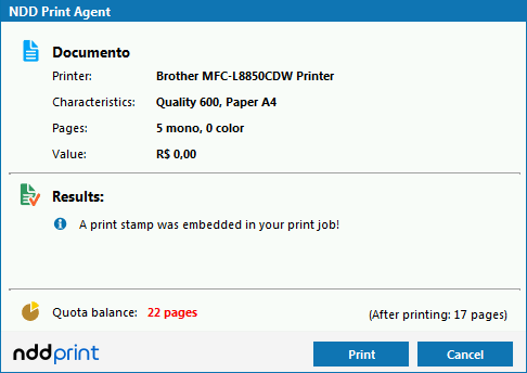 Print stamp with text: In this case, additional info can be printed within each printed page, such as: user name, domain, date and time, computer name, etc. It will all depend on the configuration made by your system administrator.