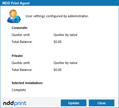 You can view your quota balance by clicking on the NDD Print Agent icon located on the Windows clock bar. When you open the NDD Print Agent, the following information may be displayed: