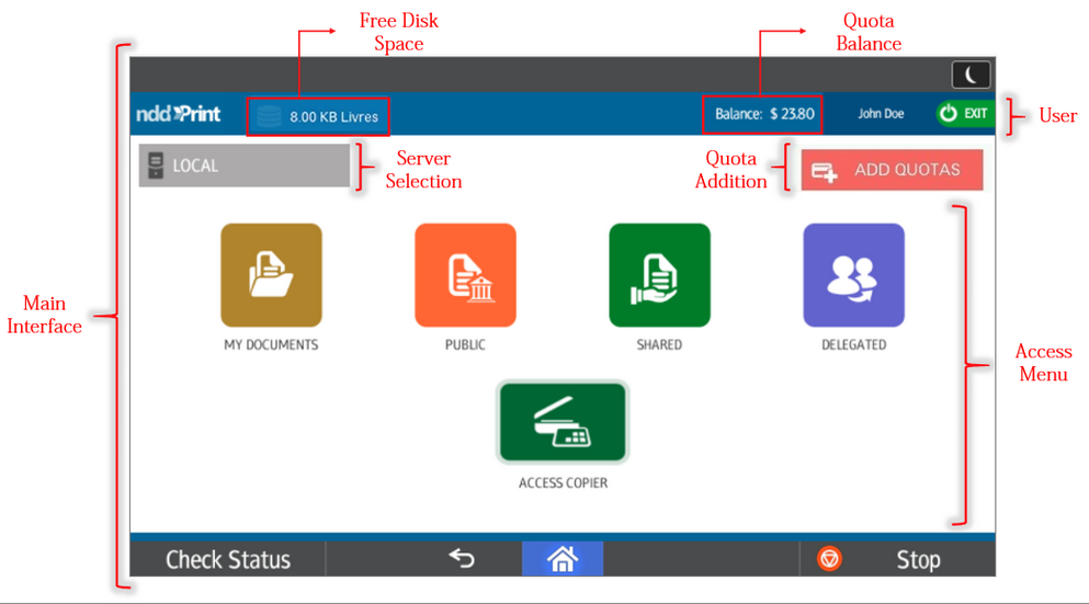 Respecting the settings chosen for the environment, the user can access his print jobs through My Documents, Public Documents, Shared Documents or Delegated Documents and can access the MFP's native functions through the icon Access Copier.