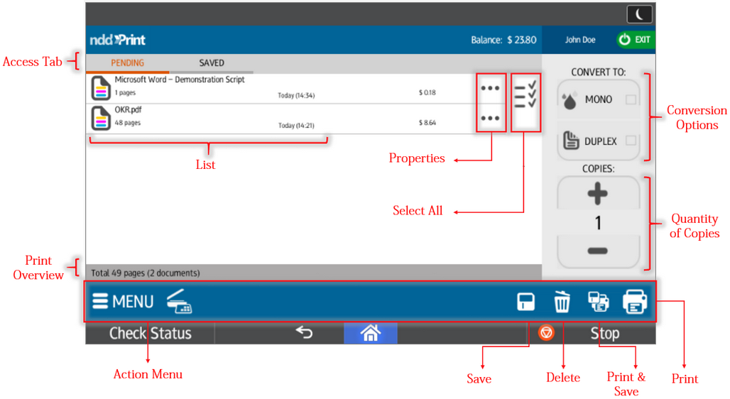 In this interface the user interacts with the documents shown in the grid. After selecting the documents, choose the desired action (Print, Print and Save, Delete, Save, Change Amount of Copies, Convert to Mono and/or Duplex and view the document's properties).