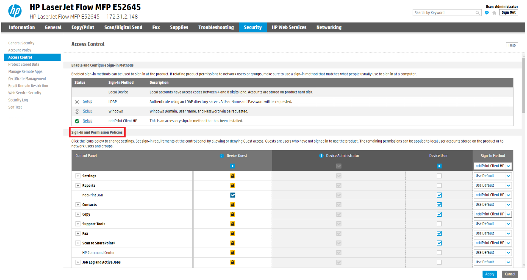 Define the Control Panel login method and the features marked as NDD Print Client HP login method (column on the side).