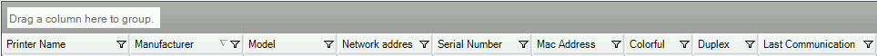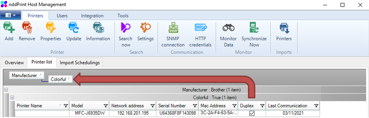 To group the printers > tab Printer list > click and drag the desired column to where it says "Drag a column here to group"