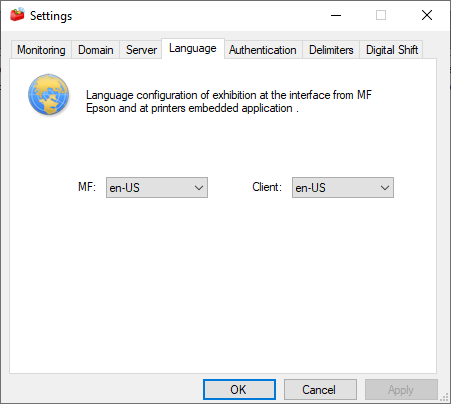 Language: Select the language that will be displayed in the NDD Print MF Epson administration interface and in the interface of the solution embedded in the device (NDD Print Client Epson).