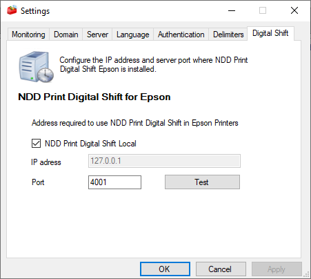 Address: Fill in the IP address of the server where the NDD Print Digital Shift Epson is installed.