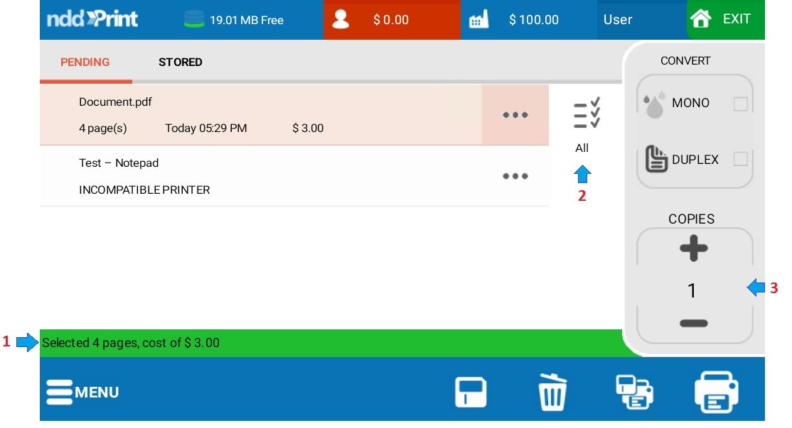 Red Bar: the quota limit for the authenticated user has been exceeded. The authenticated user will not be able to proceed with printing (blocking quotas).Select all documents: click to select all documents (only available in Pending Documents interface)