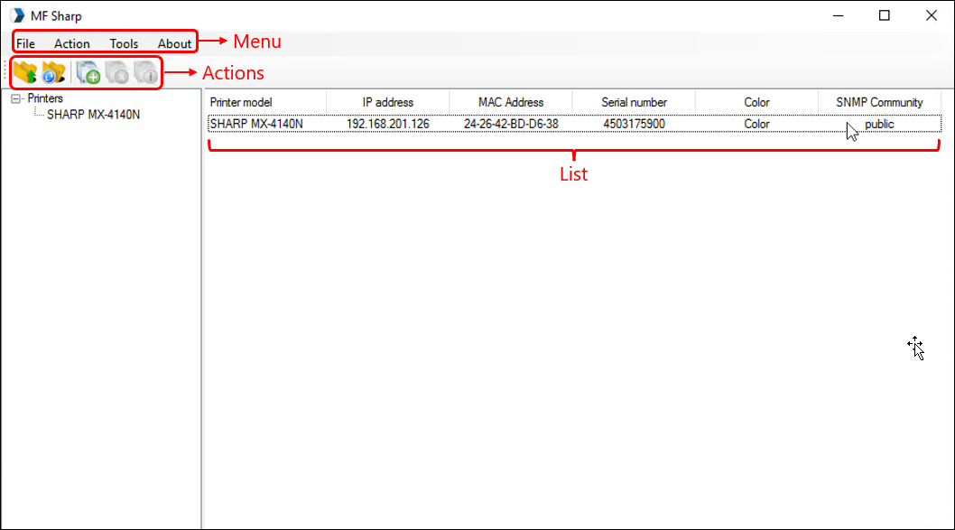 In the next topics, all configuration steps will be described respecting the nomenclature of the objects that make up the NDD Print MF Sharp administration interface, as shown in the image.