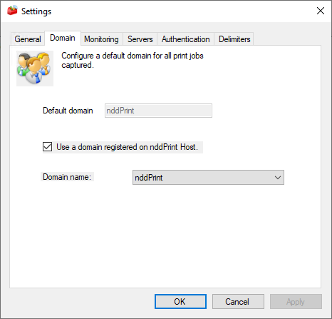 In the tab "Domain", it is possible to input a domain or automatically search and use on of the domains registered in the nddPrint Host, where users' jobs will be captured and accounted. To do so, click on "Use a domain registered on nddPrint Host", and choose the domain from the list.
