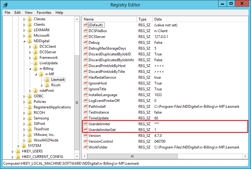 To use this feature, open the Windows registry and follow the path HKEY_LOCAL_MACHINE\SOFTWARE\NDDigital\n-Billing\n-MF\Lexmark. Inside this path you must create the following string values: