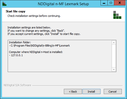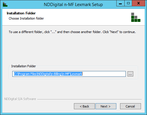 Next, it is necessary to set the directory address of where the n-MF Lexmark will be installed at. By default, it's suggested the directory: C:\Program Files\NDDigital\n-Billing\n-MF\Lexmark. After configuring the directory, click Next.