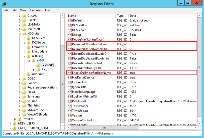 To enable this feature, open the Windows registry and follow the path: HKEY_LOCAL_MACHINE\SOFTWARE\NDDigital\n-Billing\n-MF\Lexmark. Inside this path you must create the following Values: