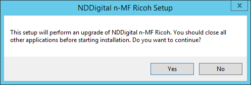 Versions prior to n-MF Ricoh 4.2.0 where native x86, so that they were executed in compatibility mode when in x64 environments. This way, the update in x64 environments requires the previous version to be uninstalled before the installation of the latest one, as the new version run natively in x64 environments. To perform the update, execute the installation package of the n-MF Ricoh, where a message will inform the necessity to uninstall the previously installed package. Click Yes to proceed.