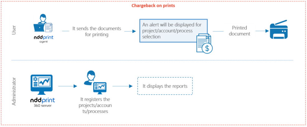 In this scenario, the NDD Print Agent interfaces with users, presenting an alert whenever a document is sent for printing. For administrators, through NDD Print 360 Server, it allows the registration of projects/processes/accounts, as well as viewing the reports referring to functionality.