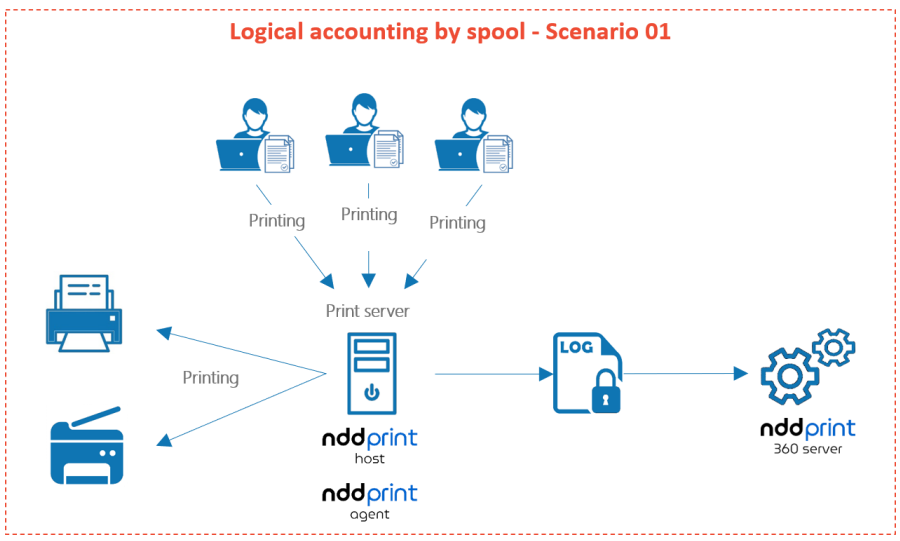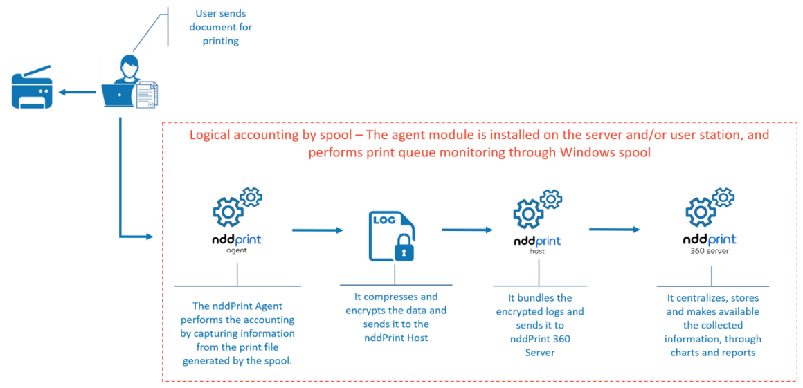 Logical accounting by spool is performed by the NDD Print Agent module, which when installed on the server and/or user workstations, captures information from the print file generated by the Windows spool, or Linux CUPS, generates a encrypted log and sends the information to the NDD Print Host.