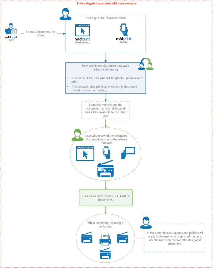 This feature allows users to delegate a print to another person, thus allowing that other person to release the document by logging into the release terminals (secure release). Note that in this case, the user who prints is not the same person who collects the print on the equipment.