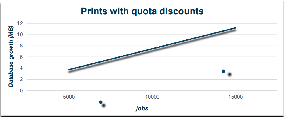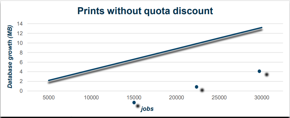 These results show that a database grows by about 7.46MB per 10,000 print jobs in scenarios where quota control is performed, and grows by about 4.4MB per 10,000 print jobs in scenarios where quota control is not performed.