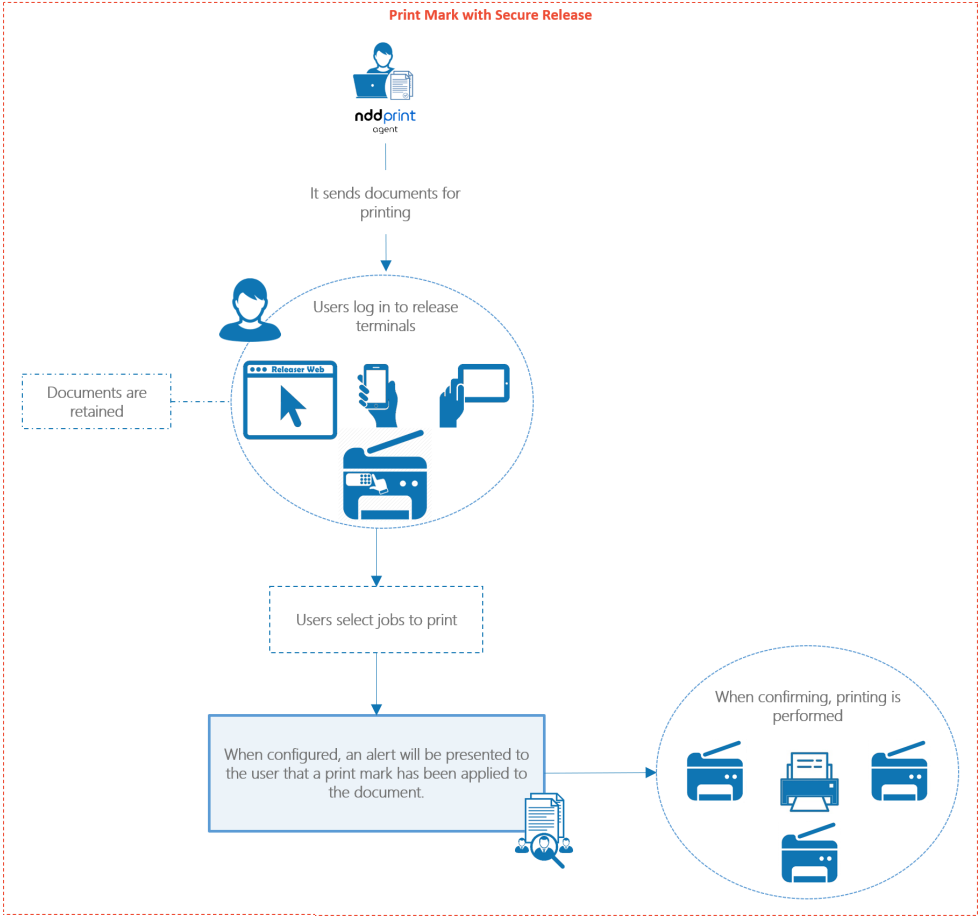 In this scenario, users send the documents for printing, which are held until they are released through authentication in the release terminals (Releaser Web, 360 Android/iOS, Touch Terminal or Login to the equipment).
