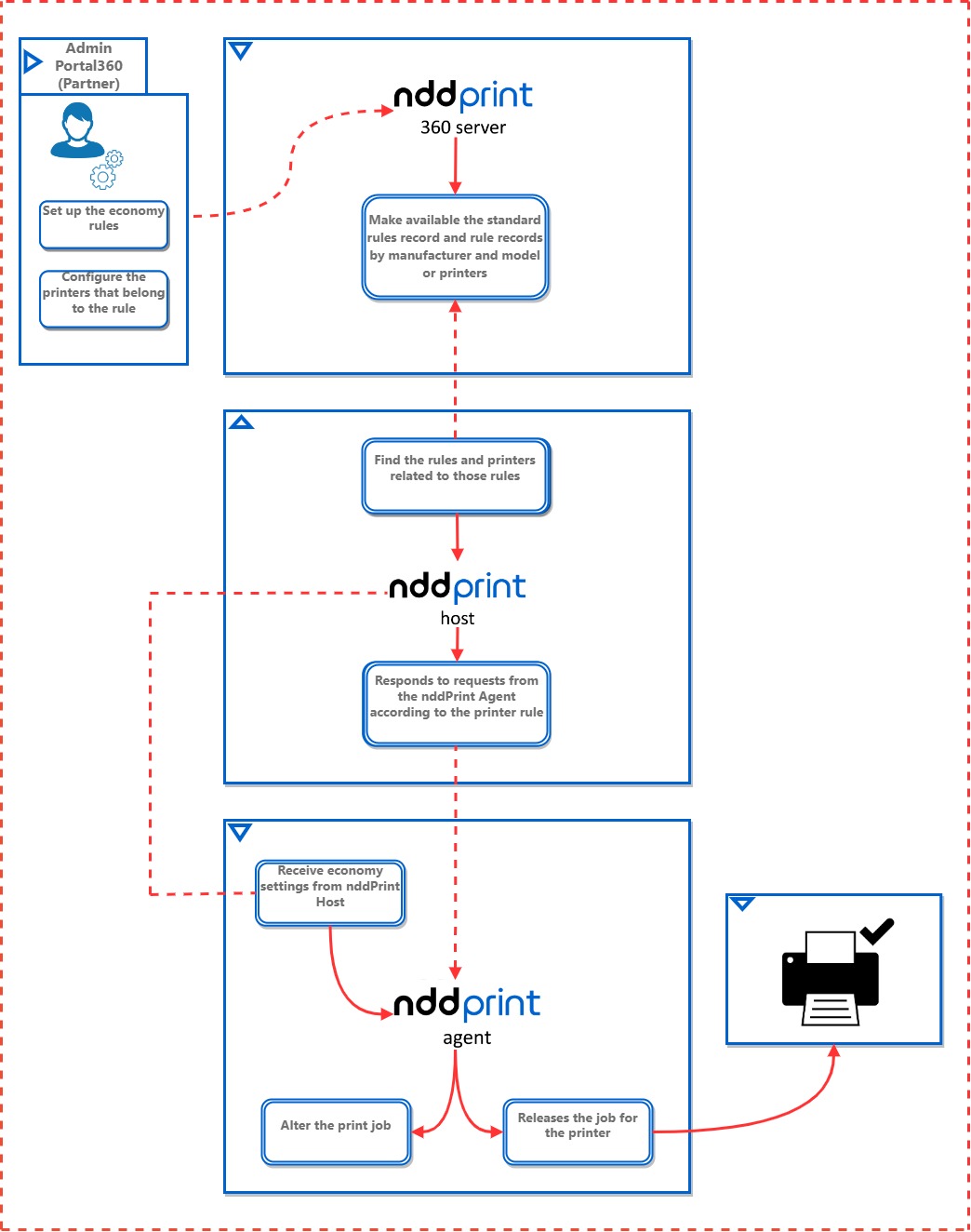 The NDD Print 360 Server module (Portal 360) is responsible for providing the NDD print Host and NDD Print Agent modules with the registration of default rules, as well as registration of rules by manufacturer/model or printers.