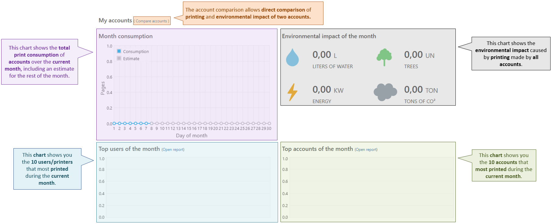 This view provides managed account printing charts, their environmental impact, as well as the month's highest consumptions.