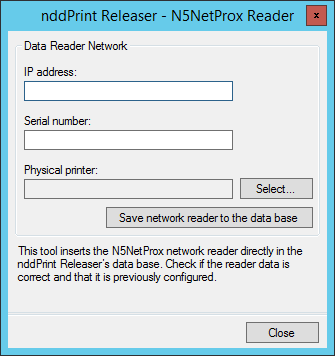 To register the reader directly in the database > installation folder > nddPrint.Releaser.N5NetProxReaderTool.exe > enter the required data > Save network reader to the data base
