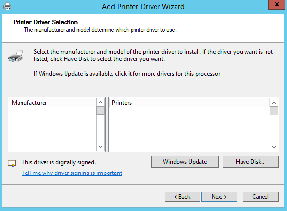 To add a driver > side menu Print groups > action Add > enter group data > keep the option Create generic print queue disabled > on Driver selection > Add
