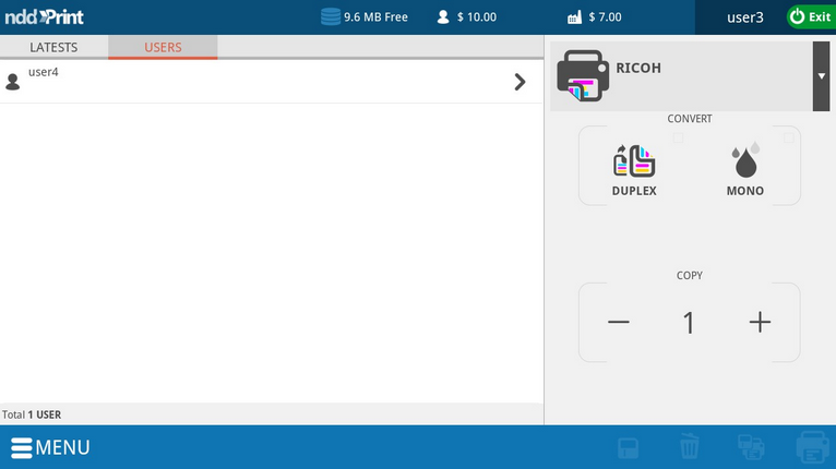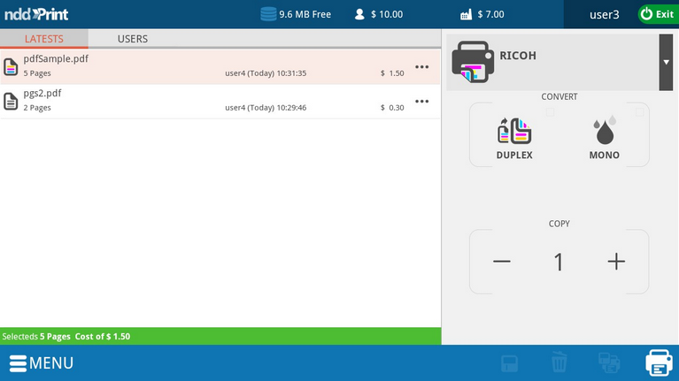 In the interface of delegated documents, the user interacts through the buttons RECENT DOCUMENTS (documents delegated in the last 24 hours) and USERS (all the document delegations per user), being that in both of the views the user can accomplish the conversion to Mono and Duplex,visualize the amount of copies, document name, owner name, pages number, values (when enabled),the sending date and printers available.