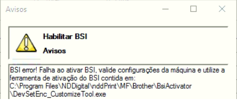 When adding the machine to the Brother NDD Print MF, the message “BSI error! Failed to activate BSI, validate machine settings and use the BSI activation tool contained in:”