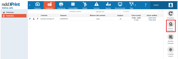Para empezar las parametrizaciones se debe crear primero el contrato, opción disponible en la pestaña Empresas > Contratos > Nuevo contrato.