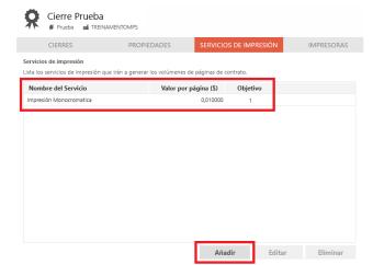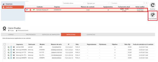 Después de crear el contrato debe agregar sus impresoras al contrato, esa opción está presente en las Propiedades del contrato > Impresoras: