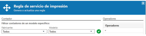 Sepa que además de las características de cada fabricante puede haber también distintas características entre modelos del mismo fabricante, entre ellos se encuentran los contadores, que pueden tener diferentes clasificaciones según las familias y modelos de equipos, para esto en el momento de creación de reglas se puede filtrar los modelos/fabricantes para comprobar correctamente los nombres de los contadores: