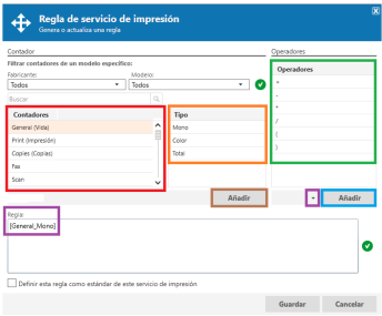 Básicamente son los contadores que compondrán el servicio de impresión, esta composición puede ser matemáticas o no, que dependerá de la forma de facturación, por ejemplo, para componer el servicio de impresión "impresiones monocromas" de un determinado contrato, se utilizan la suma de los contadores: Impresión/Mono + Copia/Mono, la suma de estos contadores son una de las posibles reglas para el cálculo de este servicio.