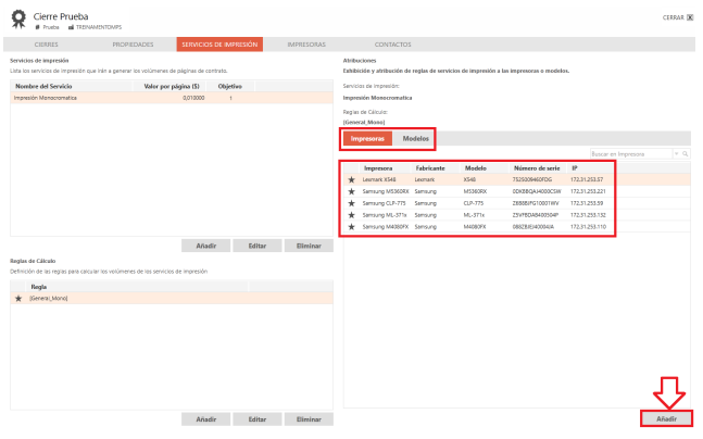 Después de ser creado los servicios de impresión y las reglas de cálculo, es necesario decir cuales impresoras o modelos que se relacionan con esta regla, para esto simplemente seleccione la regla de cálculo, después el botón "añadir" quedará habilitado en la pestaña de impresoras y modelos: