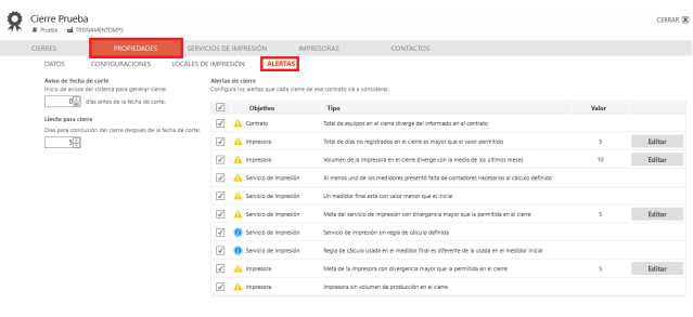 En el momento de la creación del servicio de impresión, es posible configurar una meta del servicio para el período de cierre, este valor también puede ser utilizado para generar las alertas de desvío de meta del servicio de impresión.