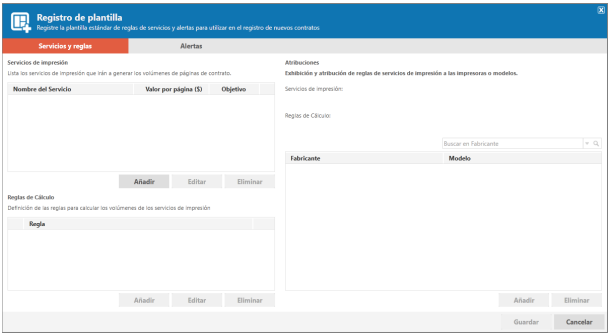 Como podemos observar en esta plantilla, es posible parametrizar servicios de impresión, reglas de cálculo y alertas.