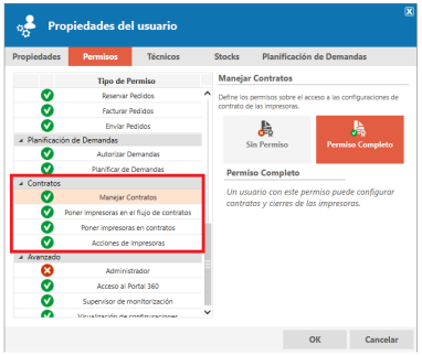 Poner impresoras en contratos: Permite al usuario permitir o restringir agregar/quitar impresoras al contrato.