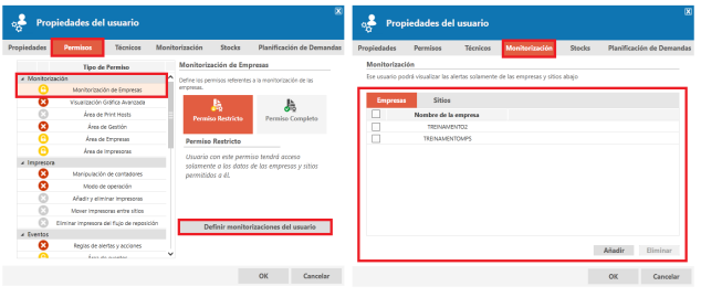 Recordando que estos permisos (detallados anteriormente) están directamente relacionadas con permisos de "Monitorización de Empresas", es decir, las reglas de permiso de empresa permiten o restringen la visualización de las impresoras de una empresa determinada.