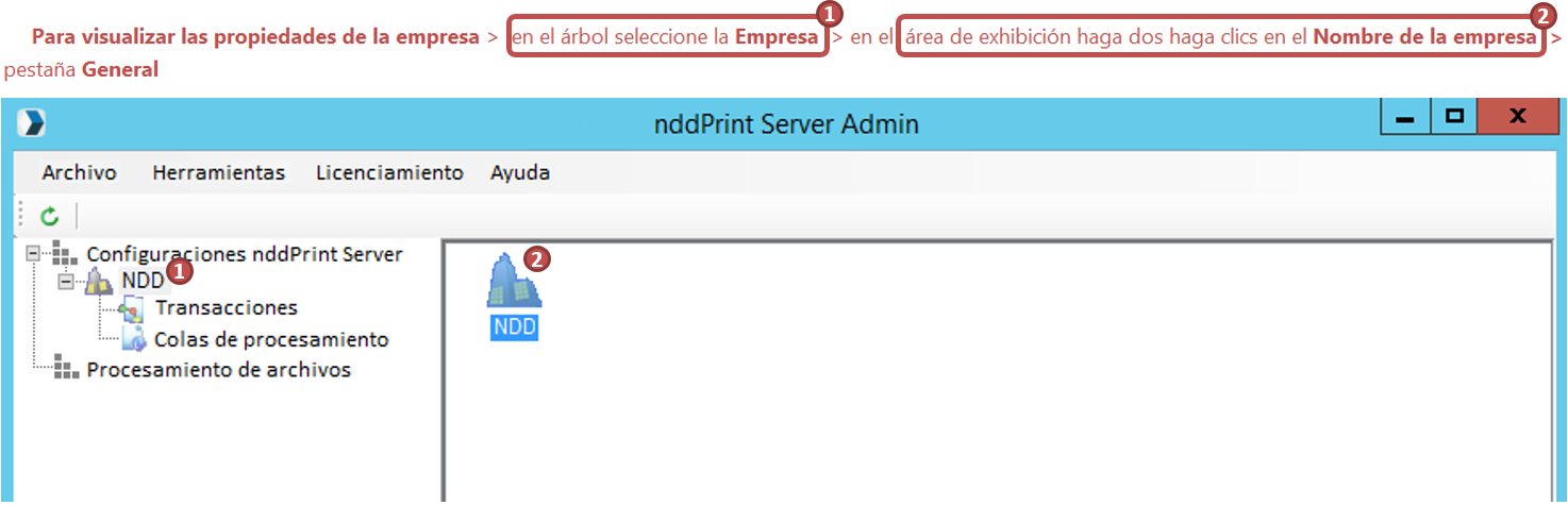 Los pasos serán descritos teniendo en cuenta la nomenclatura de los objetos que componen la pantalla del NDD Print 360 Server: