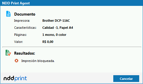 Cuando no haya créditos de cuotas de impresión suficientes para imprimir y el comportamiento configurado es el bloqueo de la impresión. En estos casos será presentado un mensaje: Impresión bloqueada: No existen créditos de cuotas de impresión disponibles.