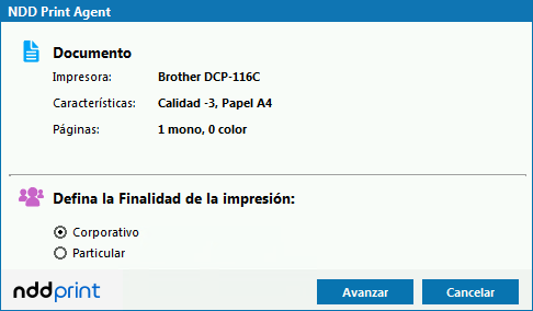 Permite informar, en el momento de la impresión, si la finalidad del documento es corporativa o privada.