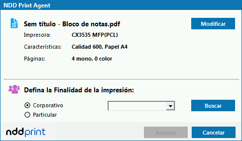Cuando la finalidad es Corporativa, si configurado, es posible informar en el momento de la impresión a cual cuenta/proyecto/proceso el documento pertenecerá. Este recurso es utilizado para agrupar los costes de los trabajos de impresión, en cuentas específicas definidas en el NDD Print Portal 360.