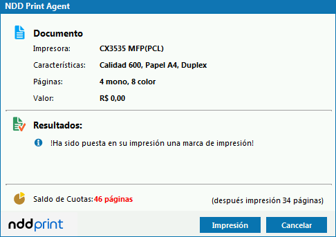 Marca de impresión con texto: En este caso pueden ser impresos datos adicionales en cada página impresa, como: Nombre del usuario, dominio, fecha y hora de la impresión, nombre del ordenador, etc. Esto depende de la configuración hecha por el administrador del sistema.