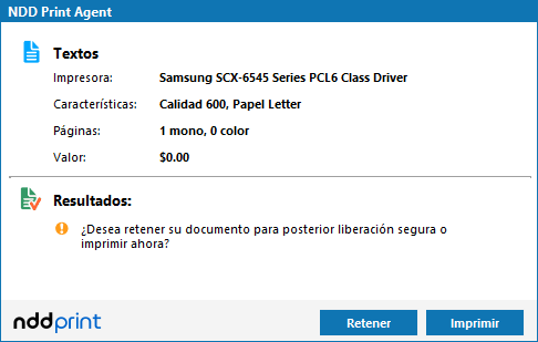 En este caso, al solicitar la impresión, será presentada una pantalla con la opción ''Retener'' documento. Esta retención permite imprimir el documento posteriormente, mediante la liberación segura en los terminales de impresión o impresoras.