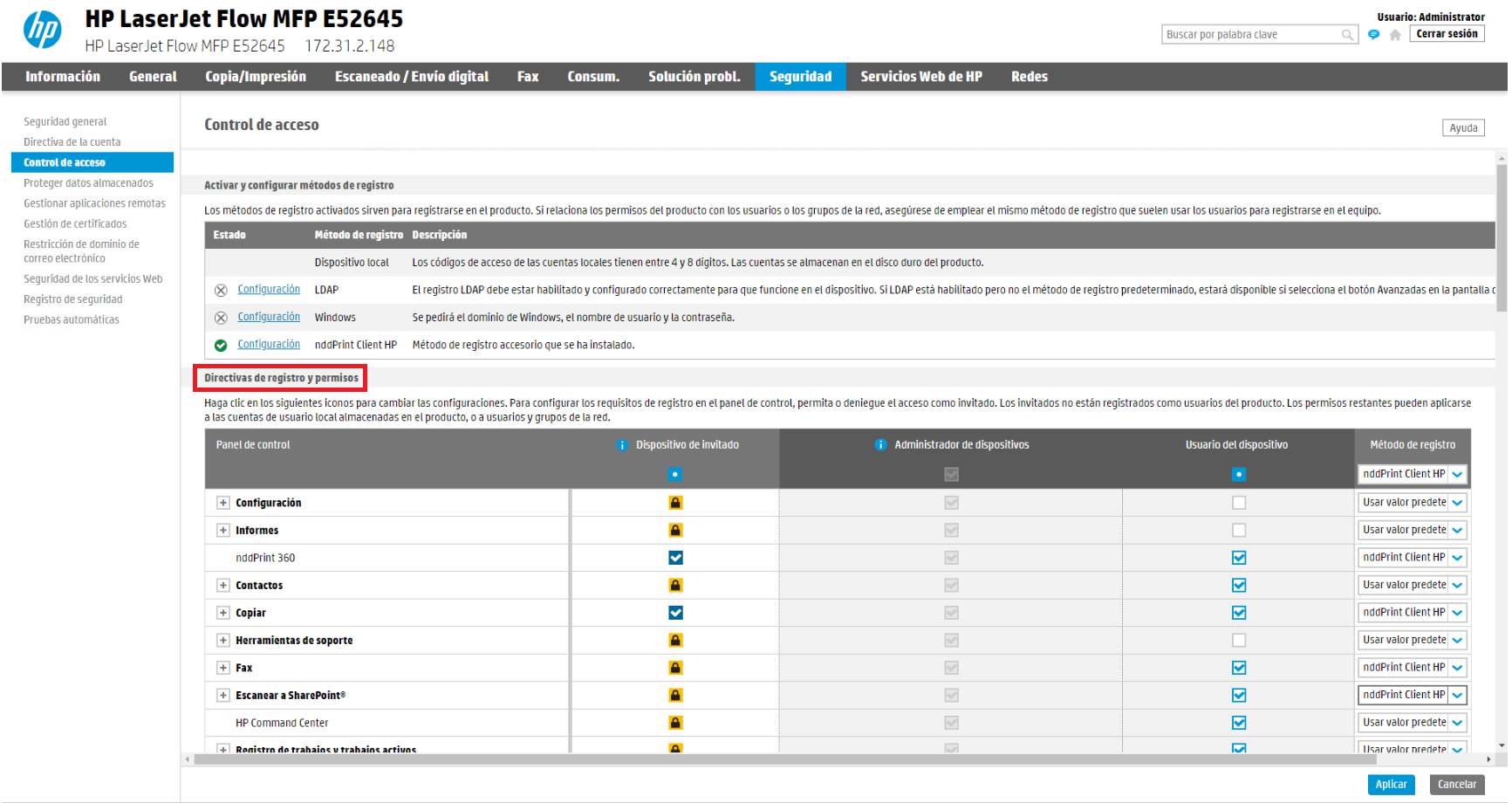 Defina el método de login del Painel de control y las funcionalidades marcadas como método de login NDD Print Client HP (columna al lado).
