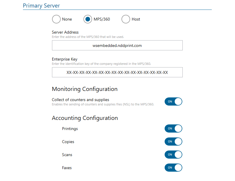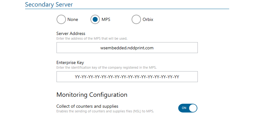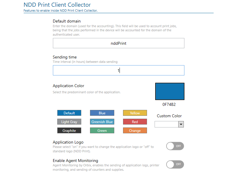 Habilite la opción NDD Print Client Collector y complete los campos antes de enviar esta configuración a la(s) impresora(s) deseada(s).