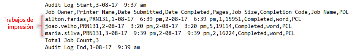 Nombre del Servidor; IP del Servidor; Sistema Operativo; Cola de Impresión; Modelo de la impresora; Driver de la cola; Dirección de la impresora; Origen; Dúplex; Tamaño del papel; Calidad; Color; Número de páginas; Fecha; Hora; Dominio; Usuario; Titulo; Serial de la impresora; MacAddress de la impresora; JobType