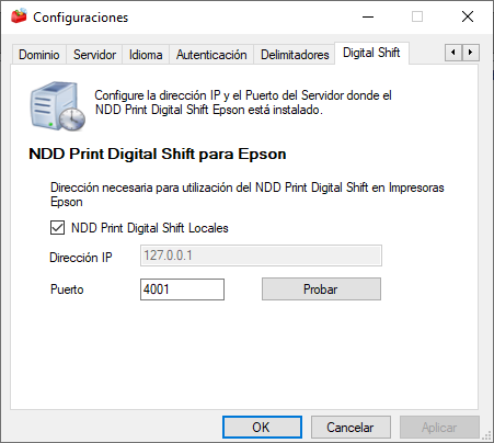 Puerto: Introduzca el puerto de comunicación con el NDD Print Digital Shift Epson.