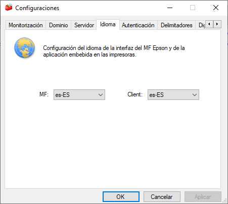 Idioma: Seleccione el idioma que se mostrará en la interfaz de administración de NDD Print MF Epson y en la interfaz de la solución embebida en el dispositivo (NDD Print Client Epson).