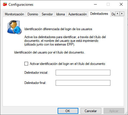 Identificación diferenciada del usuario de inicio de sesión: Si utiliza un sistema ERP, configure los delimitadores para identificar al usuario que envió la impresión a través del título del documento. He aquí un ejemplo: