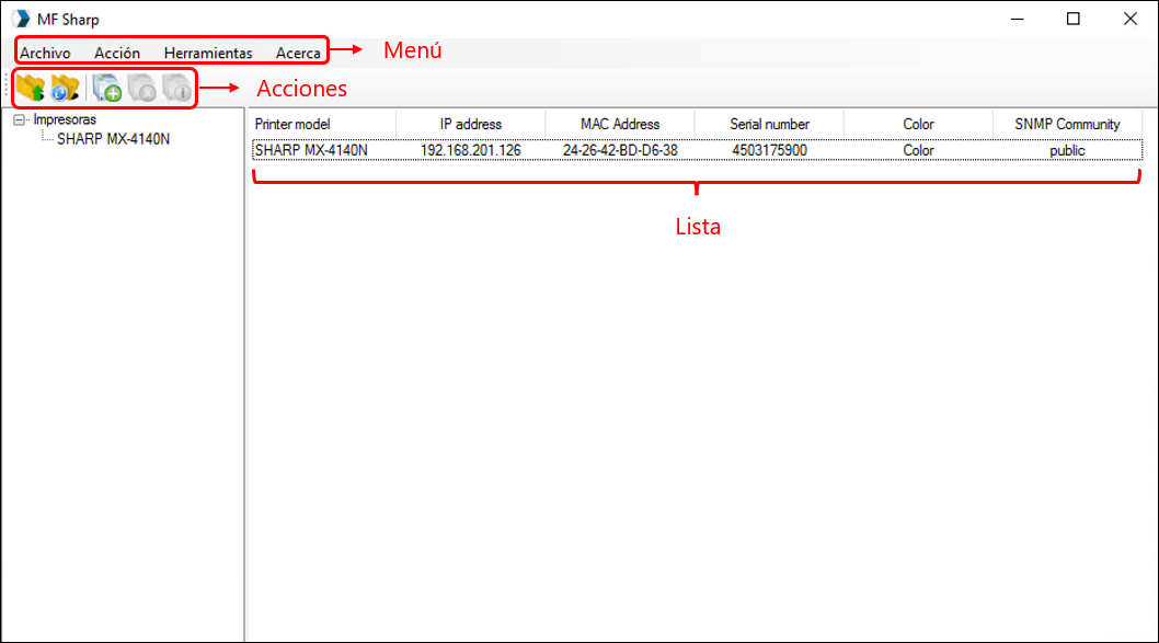 En los siguientes tópicos, todos los pasos de configuración son descritos siguiendo la nomenclatura de los objetos que componen la pantalla de administración de NDD Print MF Sharp.