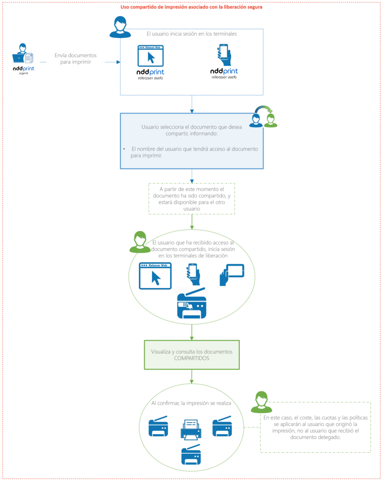 Esta funcionalidad permite a los usuarios compartir los documentos enviados para la impresión con otros usuarios. Estos documentos quedan disponibles hasta que el usuario que realizó el compartir los elimine.